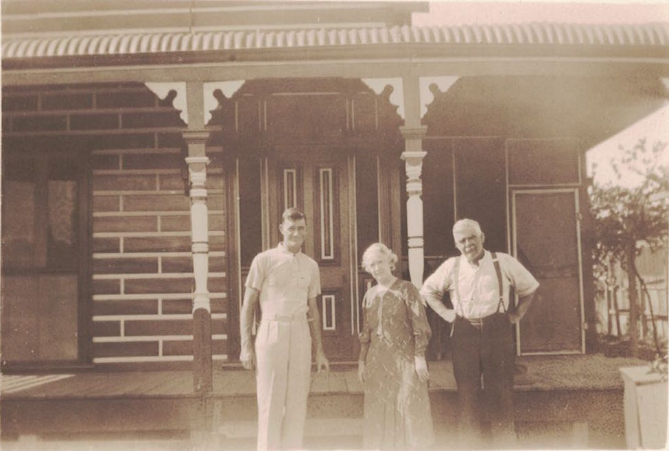 Here is an earlier and more graphic photograph of the house, with my uncle Frank Reudavey (born 1904) and my grandmother and grandfather standing in front. Frank married my Aunt Adie in 1934, so it's later than that, but before 1943, I think, as Grandad has not yet built on the final room which would take up all of that corner of the verandah on the right of the photo. The apparently wooden steps would later become concrete. The door on the left leads to the front of the two original bedrooms: there was a flyscreen door and then a pair of French doors. Not at all secure, but then in those days we always left the back door unlocked at night.