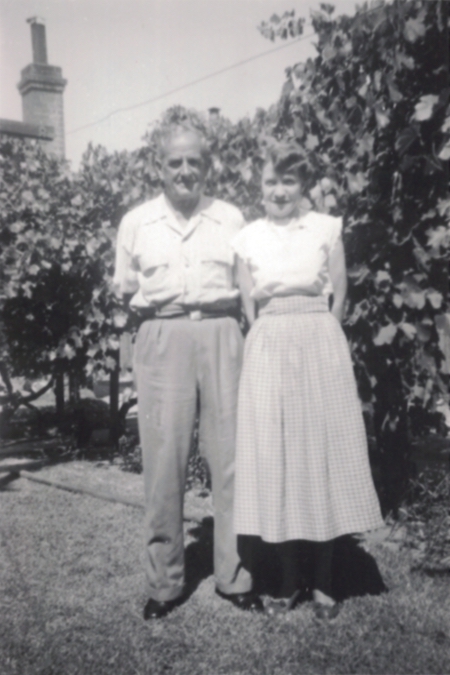 The next house, at 100, was and I think still is a brick building. In my time, it was Mr Wood's. I think he may have married again (or very late) with Mrs Wood, who had a cat, and played the banjo-mandolin, painfully slowly. I took this photo of the couple in their backyard.