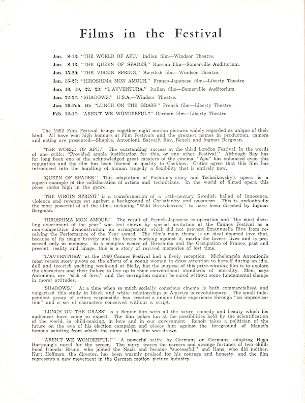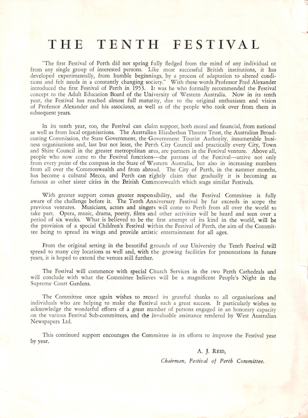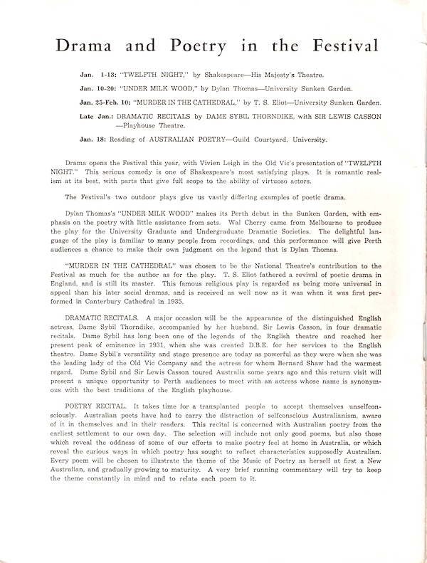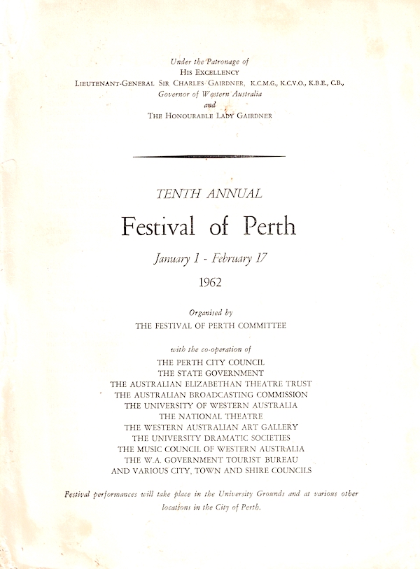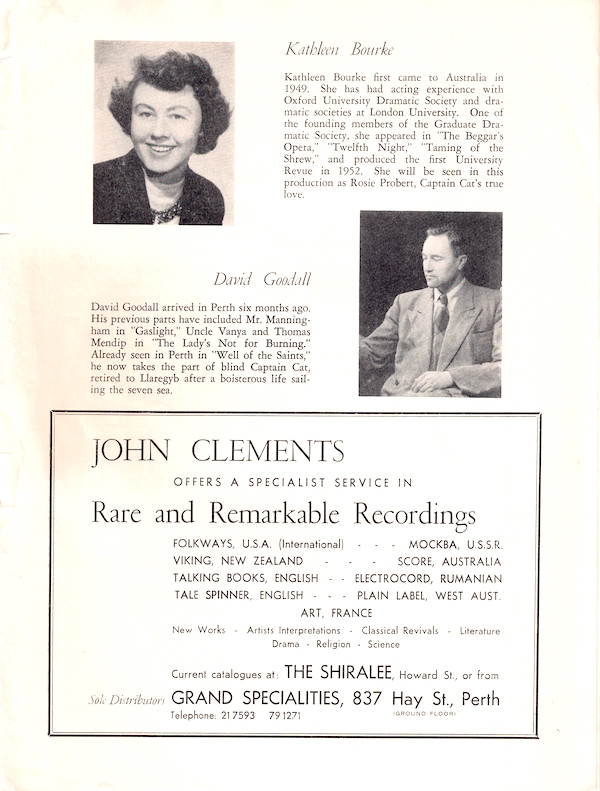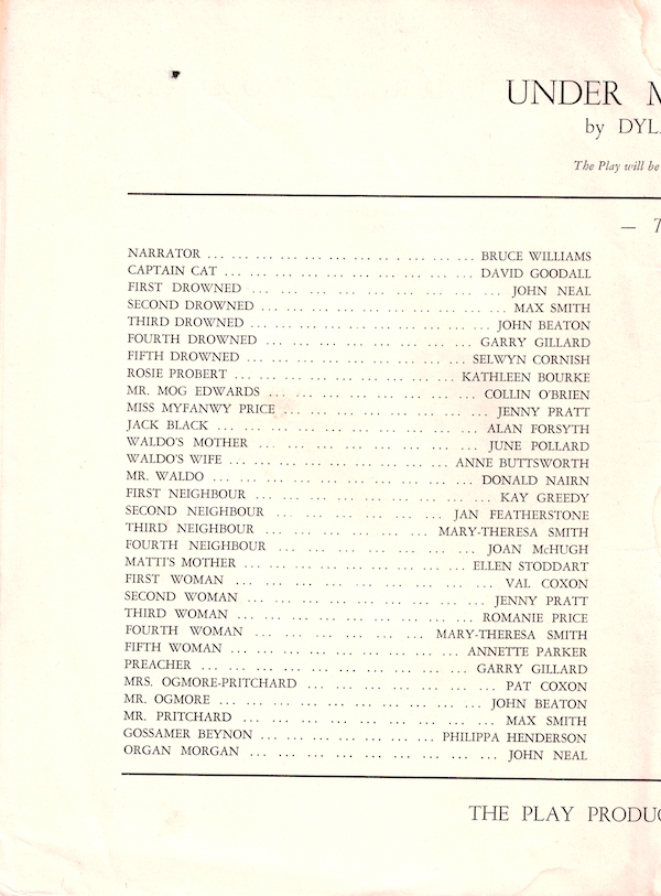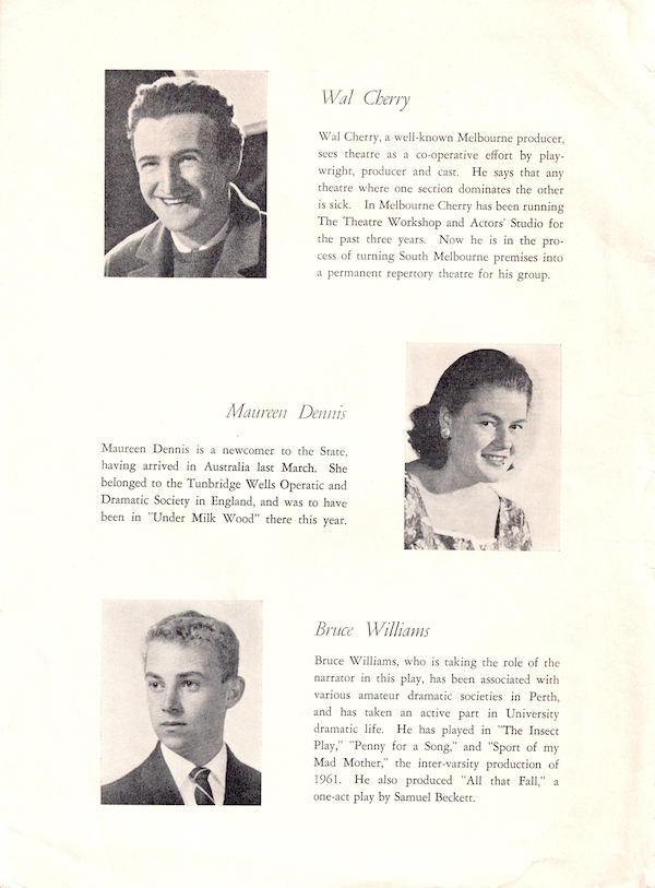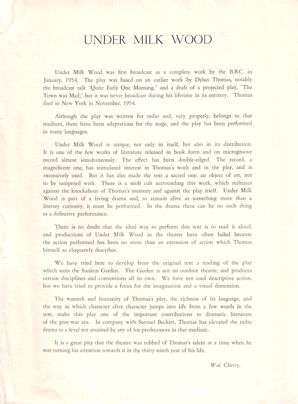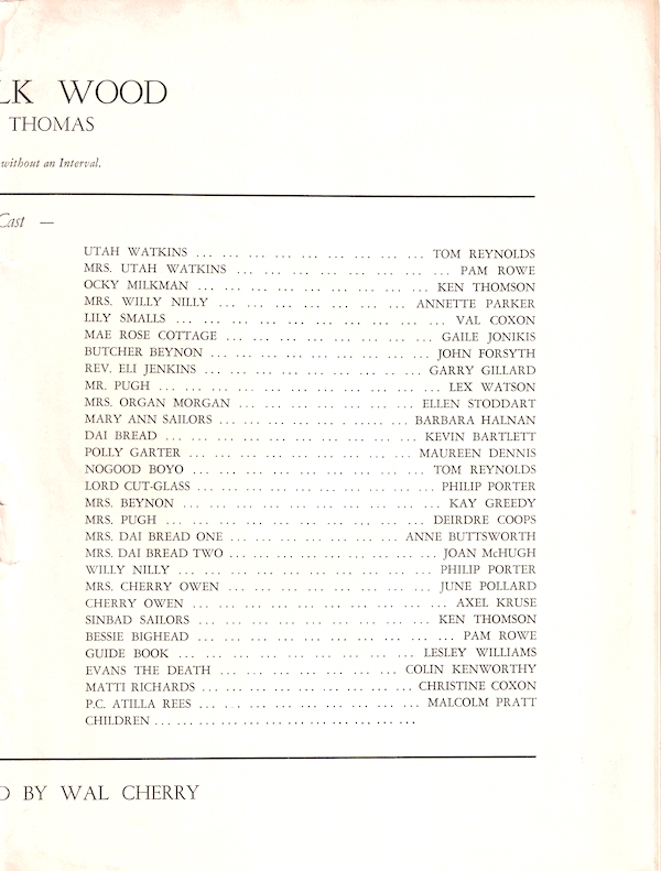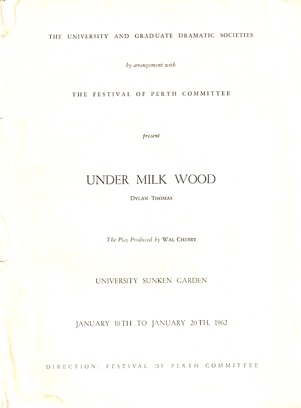 Under Milk Wood, by Dylan Thomas, was directed by Wal Cherry for the Festival of Perth in January 1962.