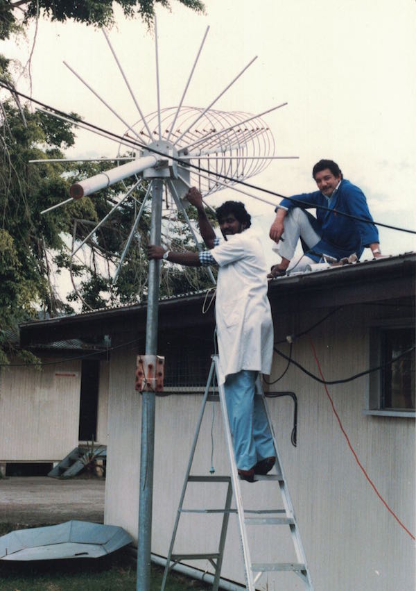Kid and his assistant Prakash working on the satellite antenna aimed at the former American weather satellite Peacesat ATS-1