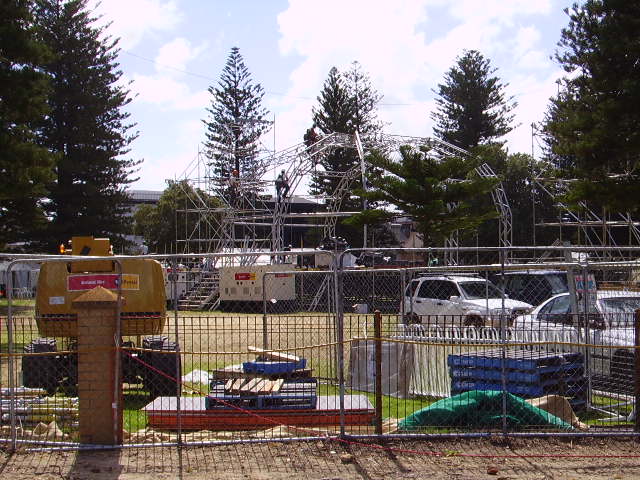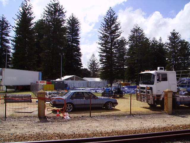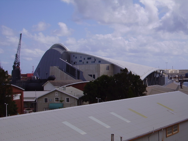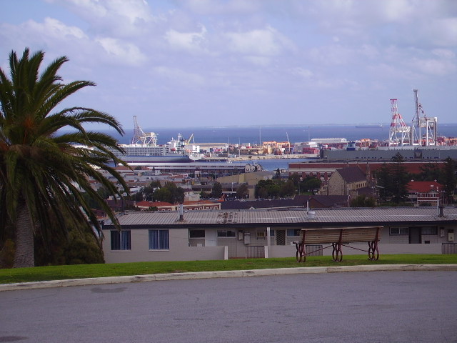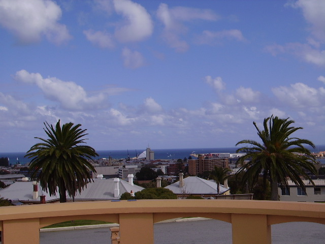 At the Fremantle War Memorial looking west to the harbour mouth. You might be able to pick out the Town Hall. The building with the sail roof is the second monument built by Richard Court to himself: the Maritime Museum.