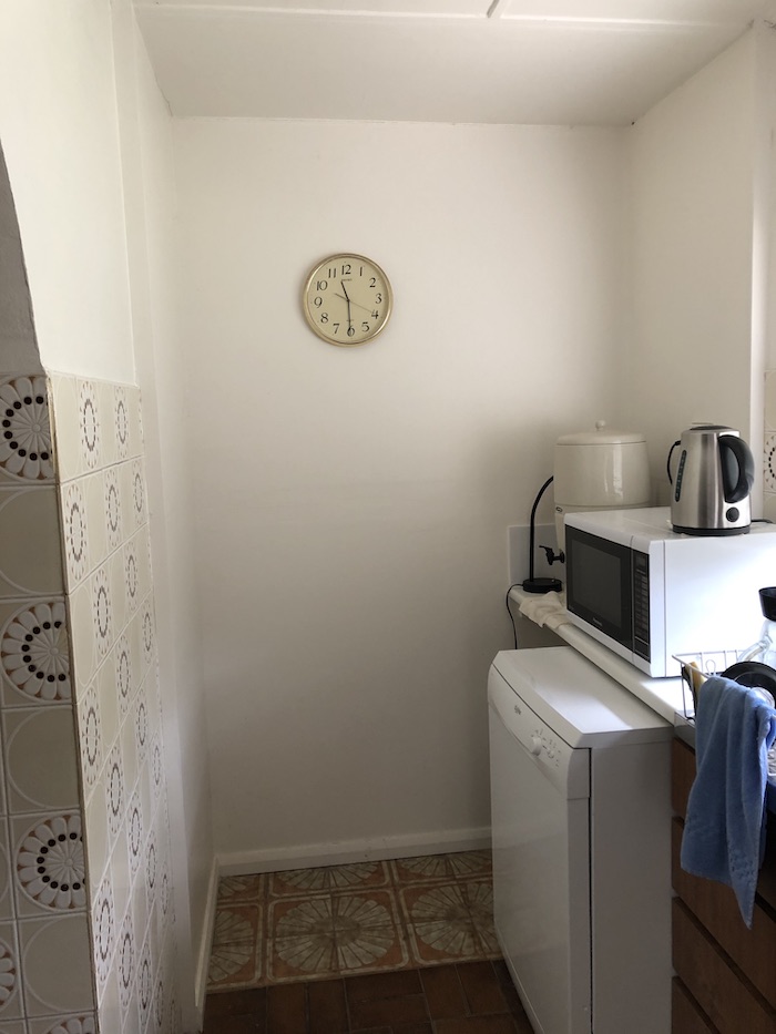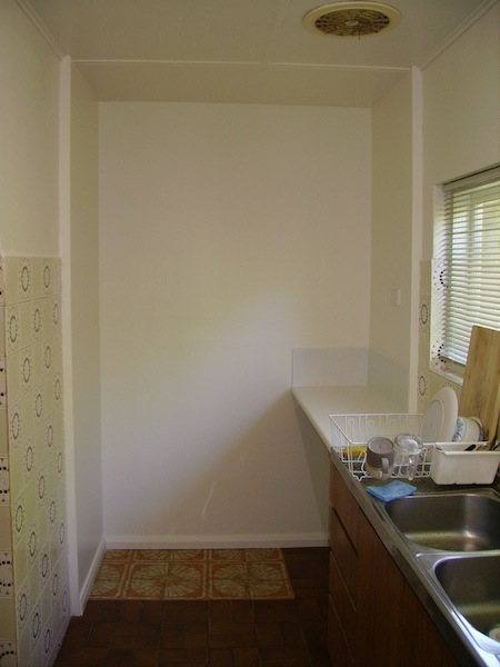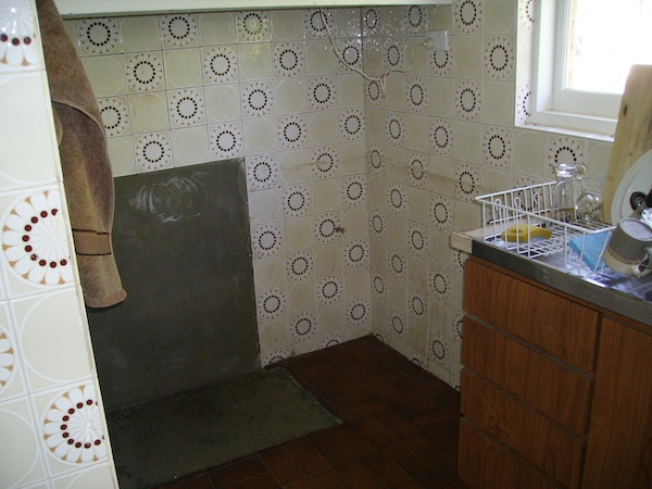 This was what the end of my kitchen looked like after I took out the solid fuel stove and an electric stove and some shitty cupboards.