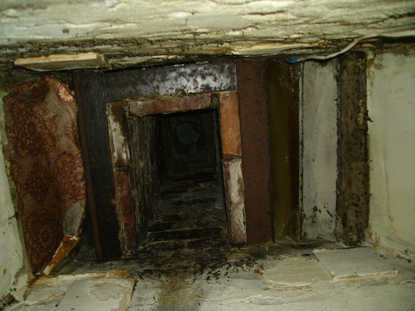 This is the view up the chimney that used to be above the solid fuel stove. All of that had to be removed, and the roof restored, and then the ceiling.