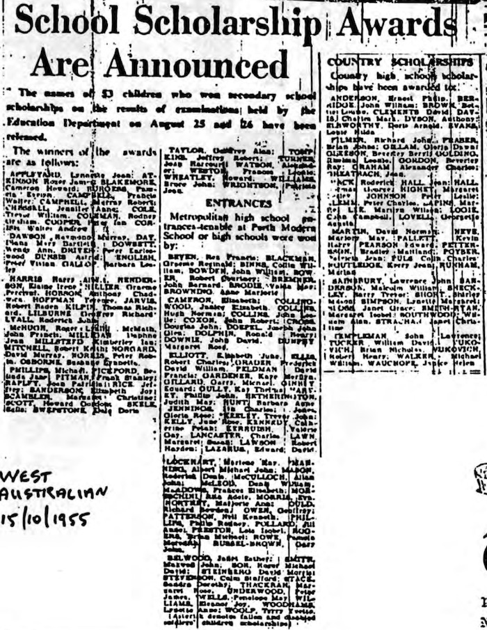 The names of people granted entrance to Perth Modern School from 1956 were published in the West Australian newspaper 15 October 1955. I personally had never seen this list until August 2019, so find it fascinating.