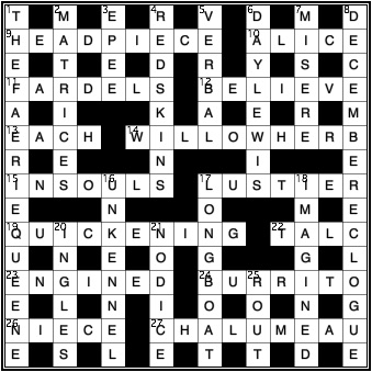 14. Willow (cricket bat) + grass = WILLOW GRASS (or willowherb: epilobium, as everyone knows :)